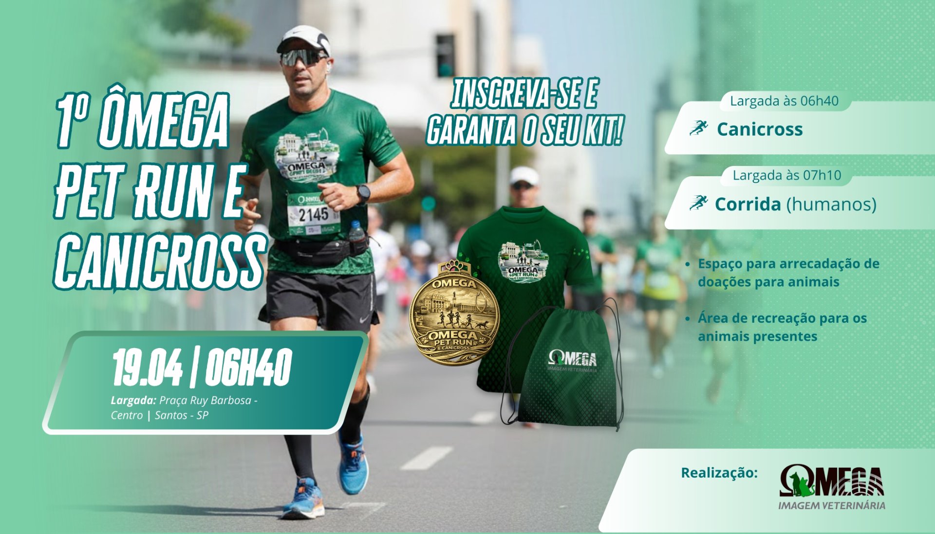 Idealizado pela Ômega Imagem Veterinária, principal clínica de diagnóstico por imagem veterinária da cidade, o evento Ômega Pet Run e Canicross acontecerá no dia 19 de abril de 2026 (domingo), a partir das 6h40, Praça Ruy Barbosa em Santos.