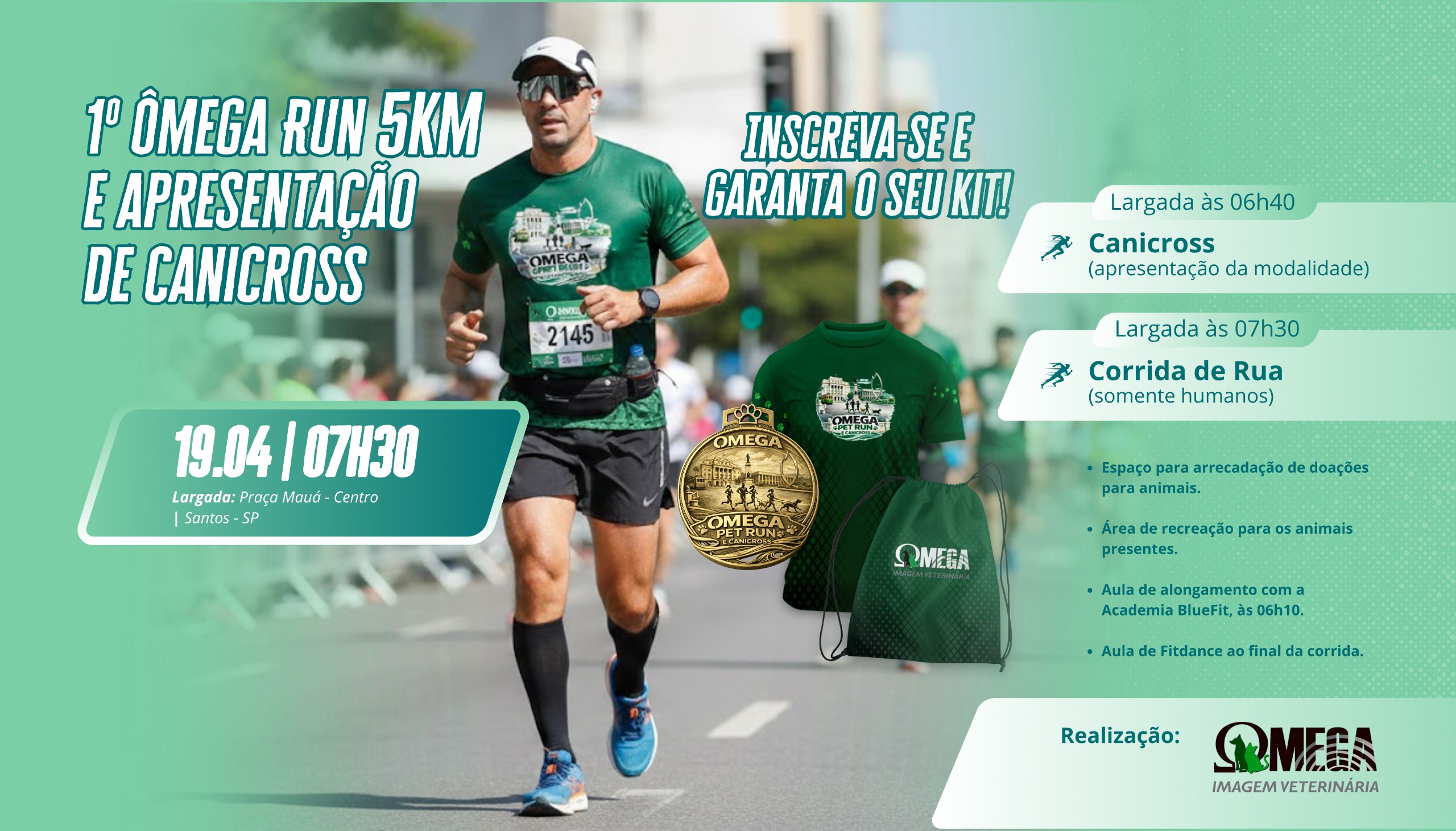 Idealizado pela Ômega Imagem Veterinária, principal clínica de diagnóstico por imagem veterinária da cidade, o evento Ômega Run e Canicross acontecerá no dia 19 de abril de 2026 (domingo), a partir das 6h40, Praça Mauá em Santos.